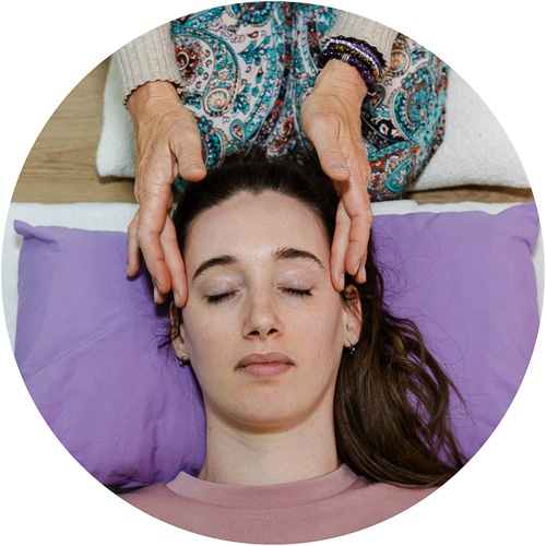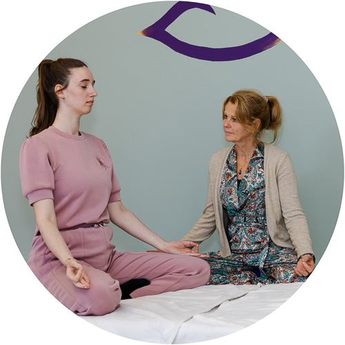 Vervolgens brengen we je lichaam volledig tot rust door middel van een bodyscan, marmapunten of yogahoudingen. Vanuit deze ontspannen toestand richten we ons verder op je ademhaling. Afhankelijk van jouw specifieke behoeften kiezen we een passende ademhalingsoefening. We passen drukpunten toe om ontspanning in je lichaam te creëren en je ademhaling te verdiepen.