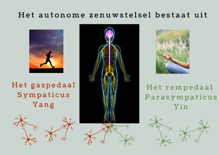 Het autonome zenuwstelsel bestaat uit 2 delen die elkaar in evenwicht houden: het actieve, inspannende gedeelte (het gaspedaal) en het ontspannende gedeelte (het rempedaal). Deze twee werken samen om de balans tussen actie en rust te bepalen. Om gezond te blijven, is het belangrijk om je lichaam na een periode van inspanning weer in de ontspanningsmodus te brengen. Tijdens ontspanning kan het lichaam herstellen, vernieuwen en dagelijkse prikkels verwerken.