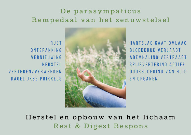 Het is belangrijk om de sympathicus alleen te activeren wanneer dat nodig is en het lichaam na een periode van inspanning weer in rust en ontspanning te brengen. Tijdens rust en ontspanning kan je lichaam herstellen, vernieuwen en verteren. Hierbij betekent verteren niet alleen het verwerken van voedsel, maar ook het verwerken van dagelijkse prikkels.